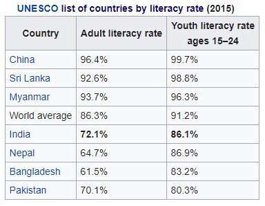 Unfortunately, when we compare this data with other countries, we have something to bother about. India is not even close to world average in literacy and not much higher from some of our neighbors.